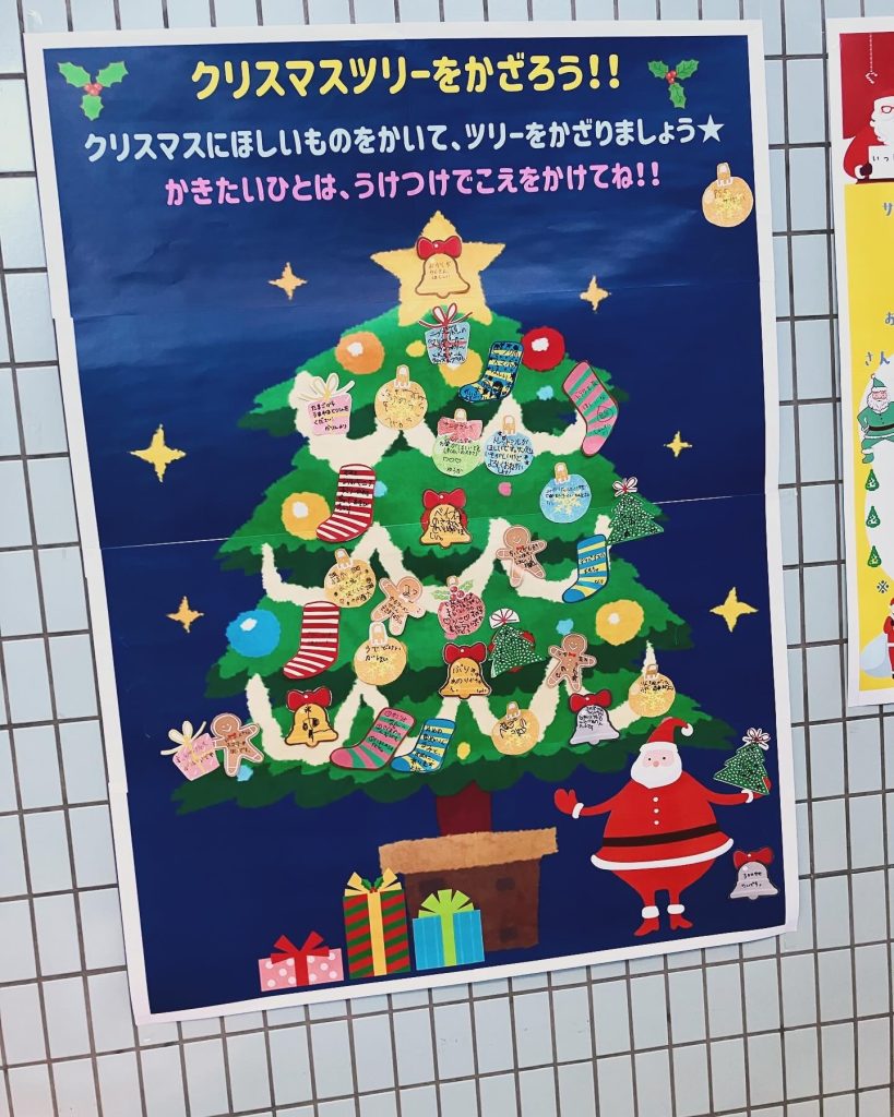 クリスマスにサンタから欲しいものを書いて、ツリーに飾れるメッセージボードです。用紙は受付でもらえるので、受付のスタッフさんに声をかけてね。