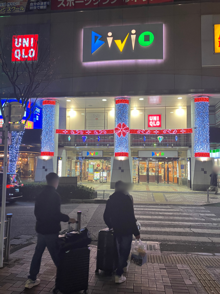 赤羽ビビオの正面入り口です。クリスマス感が出ていて、こちらは可愛らしいイルミネーションですね。UNIQLOのロゴとの相性が抜群です。