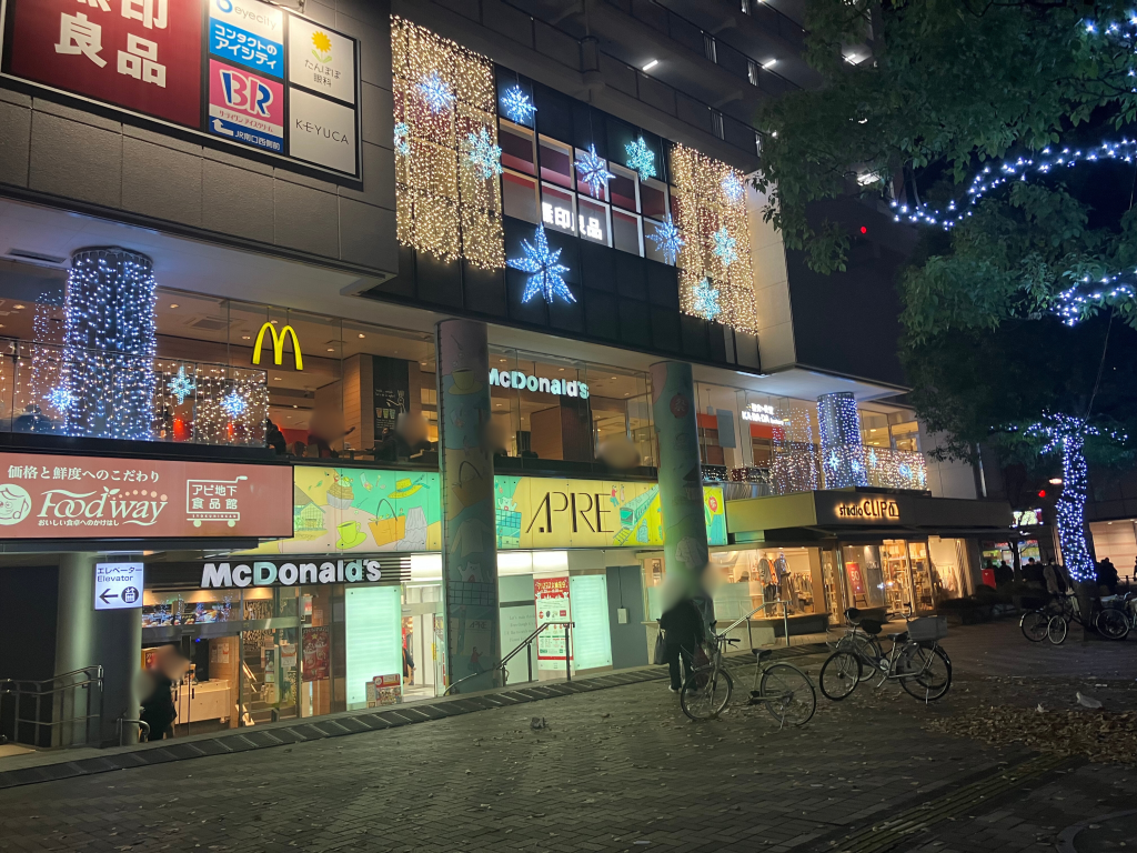 アピレの特徴は、店舗前にイルミネーションが飾れている傾向にあります。マクドナルドの2階の窓のそばにイルミネーションがありますね。客席から見るイルミネーションはどんな風に見えるのでしょうか。気になりますね。