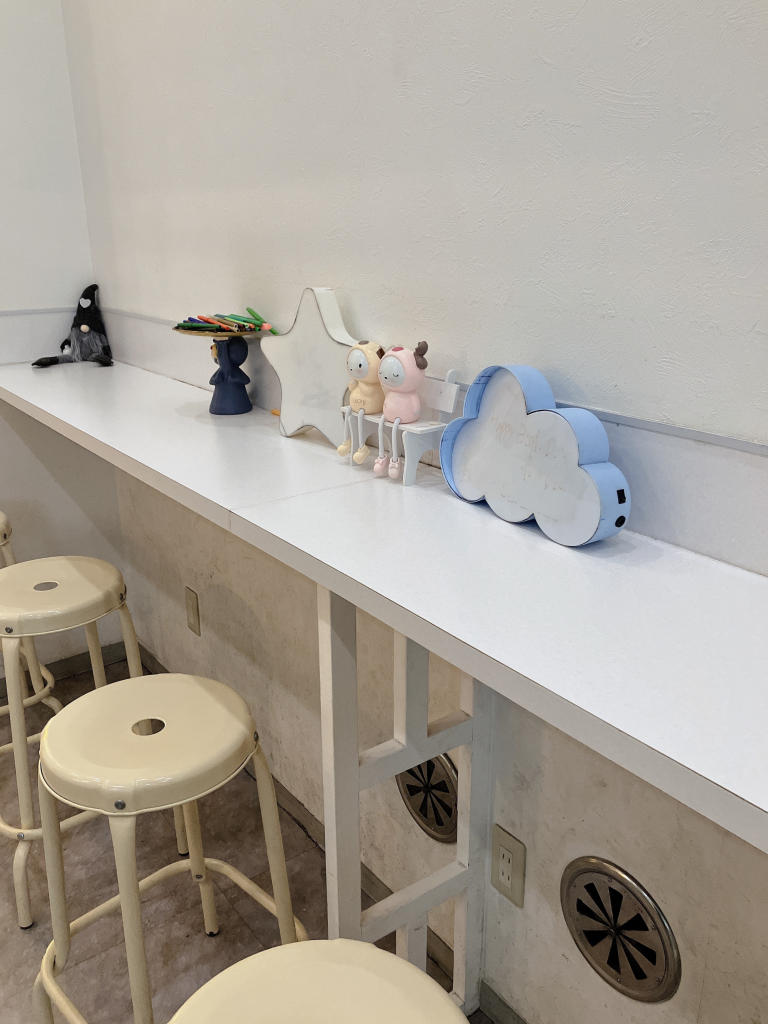 店内は、カウンターやテーブル席もあり、店内利用も可能です。店内の内装は白を基準としてパステルカラーの家具で整えられています。小物もカワイイですね。落ち着いたひとときを過ごすことが出来ますよ。