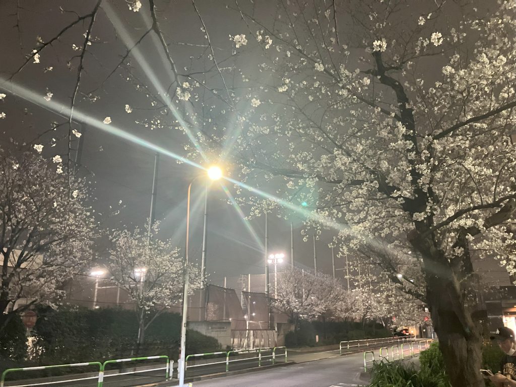赤羽岩淵中学校前の桜の木にも綺麗に桜が咲いています。グランドのライトアップがいい感じ。