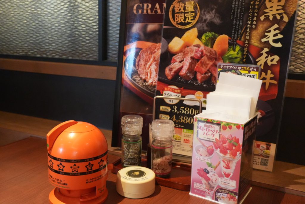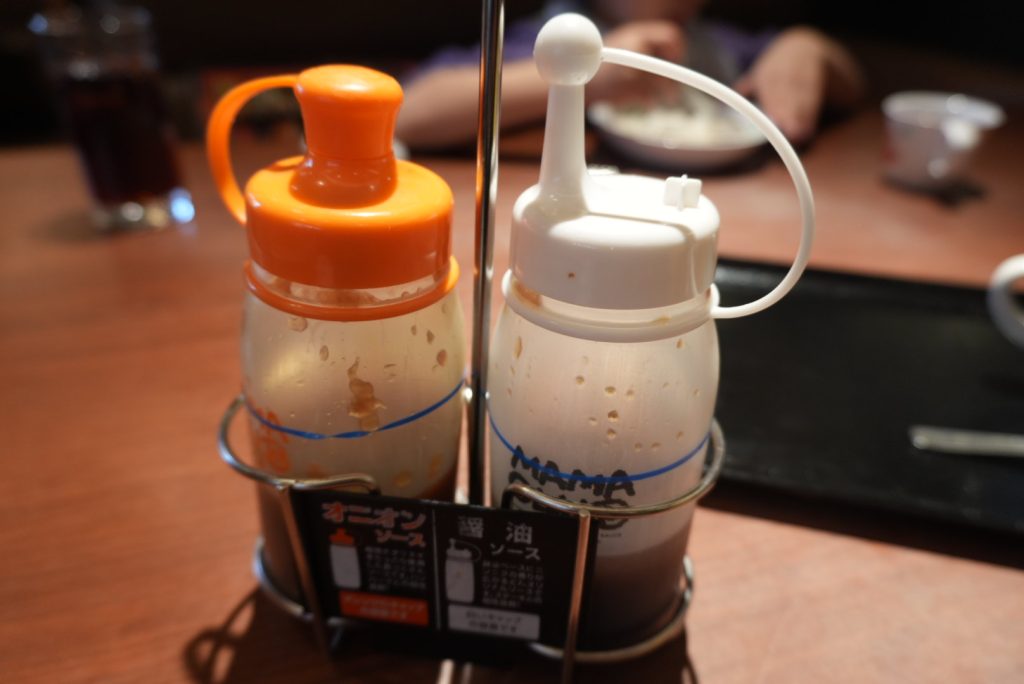テーブルには、ステーキソースが設置されており、①醤油ソース、②オニオンソースです。