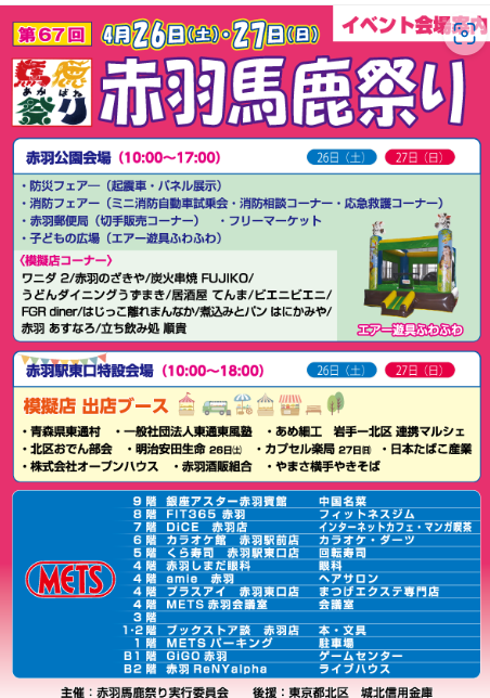 1日目は赤羽公園会場と赤羽駅東口特設会場にて出店やイベントが行われます。