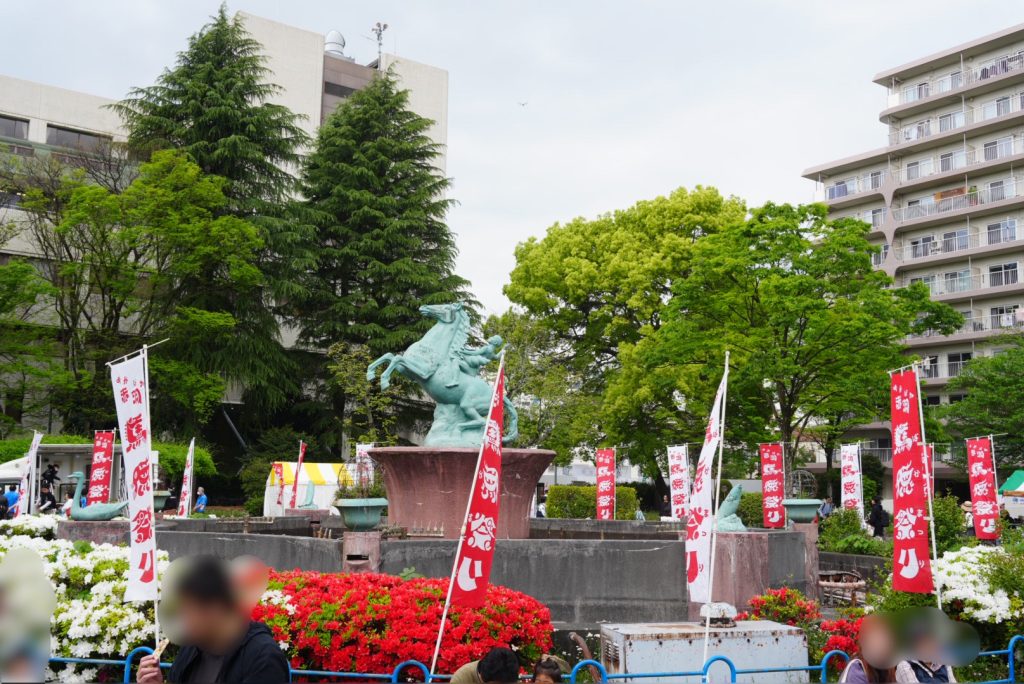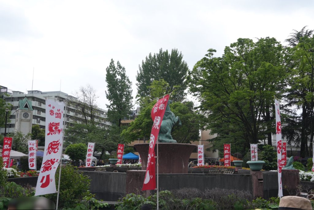 赤羽公園のシンボルの銅像の周りには「赤羽馬鹿祭り」の旗が立っていて、お祭り感がでていますね。