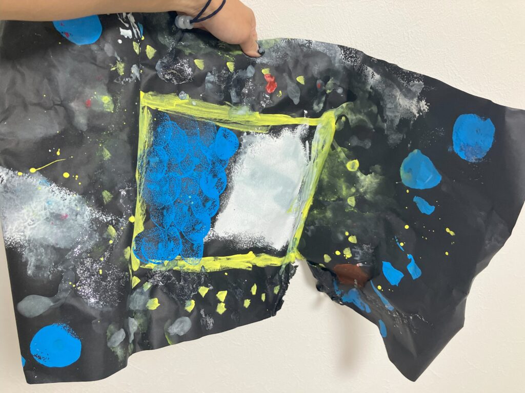 まずは、宇宙についてのお勉強をして、黒い画用紙に絵具やキラキラ絵具で自分の考える宇宙を描いたそうです。