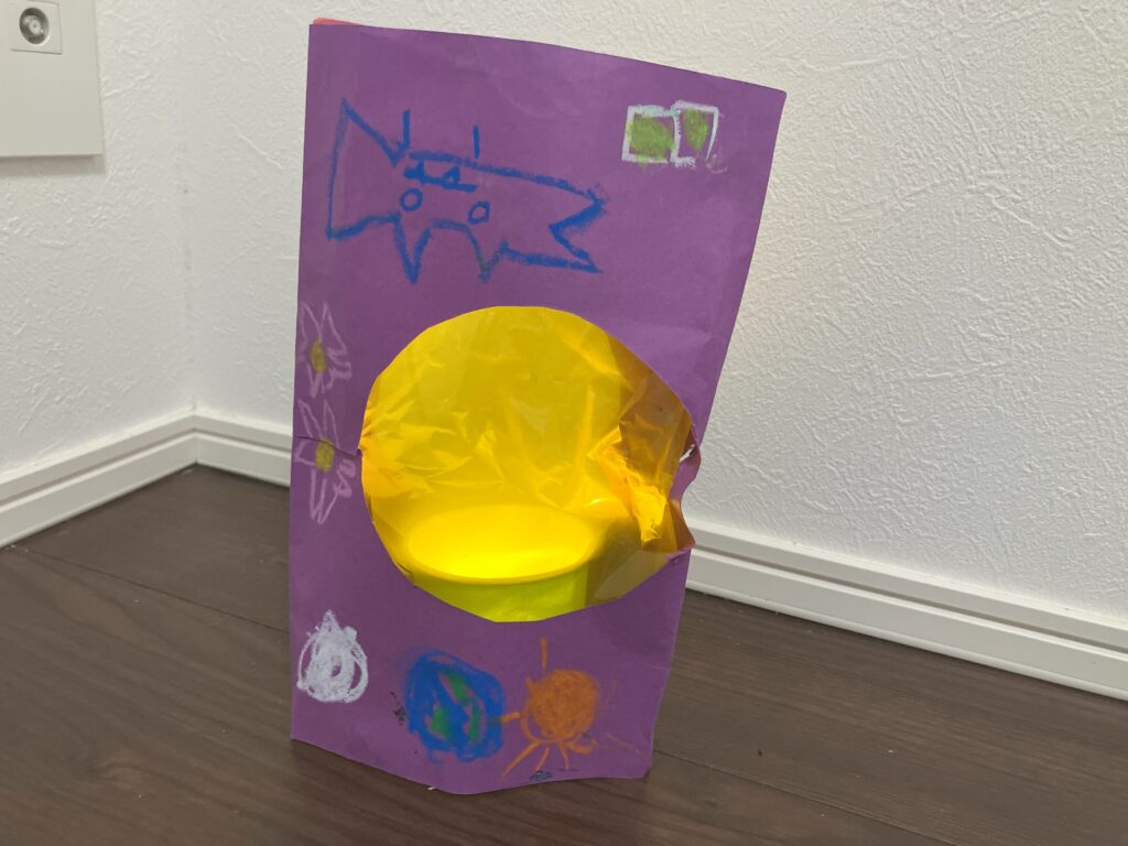 黒色または紫色の画用紙で筒を作り、穴を開けてオレンジ色のセロファン?のようなものをはtって完成です。
