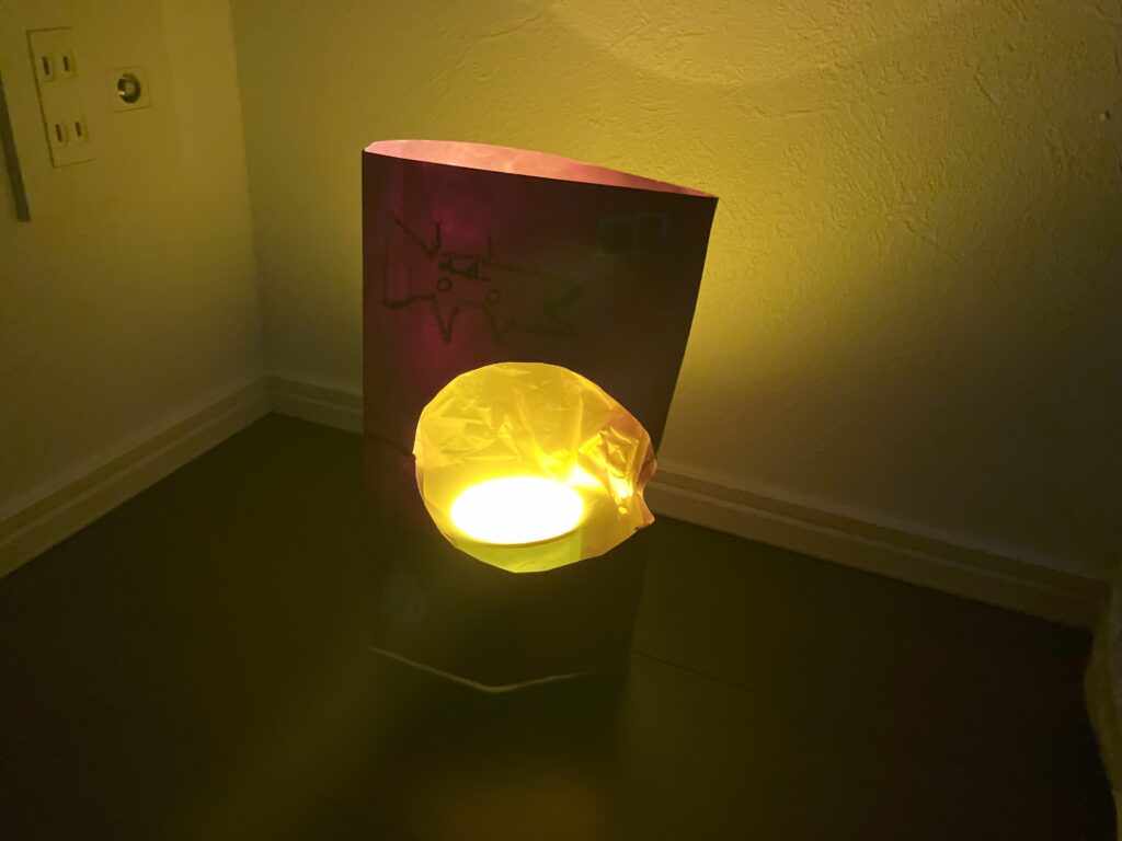 電球部分はスイッチ式の電球を紙コップに入れて、先程作成したランプシェードを被せて完成のようです。