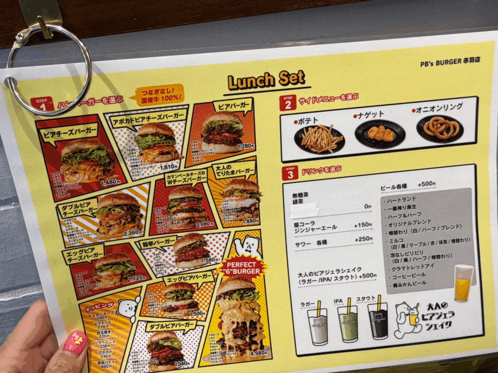 私が頼んだのは、ダブルビアチーズバーガー!こちらのお店の優しいところは、何の食材が入っているのかメニューに記載されているところ。